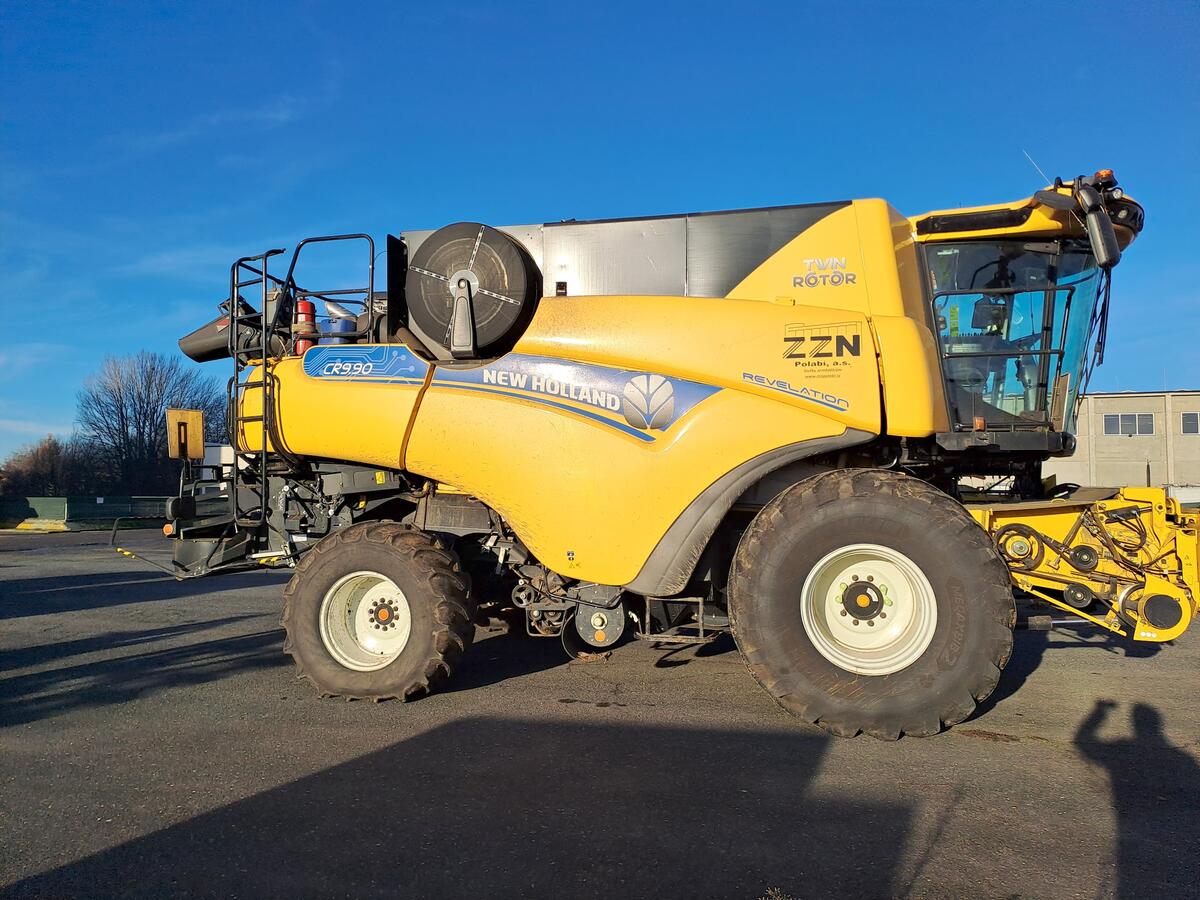 Sklízecí mlátička New Holland CR9.90, zásobník 12500, GPS, výnos, vlhko, autom. systém Intellisense, naklápění šikmého dopravníku z kabiny, LED, sklopná koncovka komínu, pojezd 40 km/hod. Lišta Varifeed 10,7 m, řepková výbava, podvozek s řiditelnou zadní nápravou, palivo: nafta, možnost financování