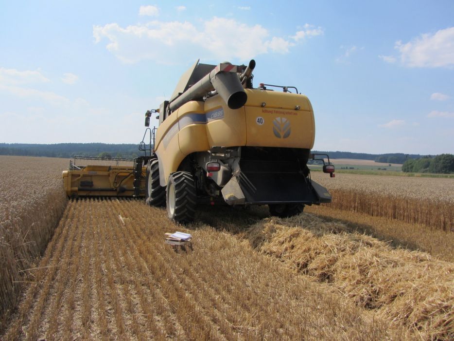 - Kontrola ztrát. Ztráty je bezpodmínečně nutné přepočítat podle záběru lišty. Pokud jedu na menší než 0,5% ztráty, okrádám se o čas, kterého letos bylo opravdu málo. Jak na to. Aktivuji rozmetače plev a slámu ukládám do řádku. Za mlátičkou si vyberu tři místa, kde provedu měření – vpravo za lištou, vlevo za lištou a mezi koly. Na každém místě si odměřím na strništi čtverec o rozměru 30 x 30 cm a v tomto čtverci spočítám zrna. Výsledky zprůměruji. Výsledek porovnám s tabulkou na „Posouvátku“. U sklízecí mlátičky se záběrem 9,15 m bude povolené půl procentní ztráty v porostu s výnosem 8 tun/ha představovat 12 zrn pšenice.